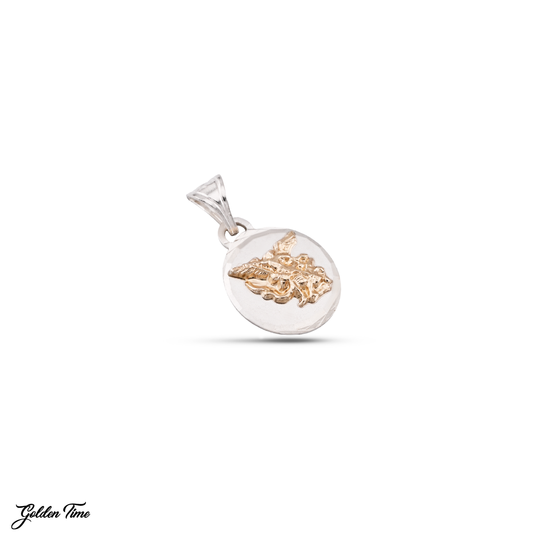 Este diseño ovalado presenta la figura de San Miguel Arcángel en un acabado dorado en relieve, resaltado sobre una base plateada brillante que crea un efecto luminoso y juvenil. Su forma suave y el contraste entre ambos tonos lo convierten en una pieza ideal para llevar a diario con un toque espiritual fresco y poderoso.