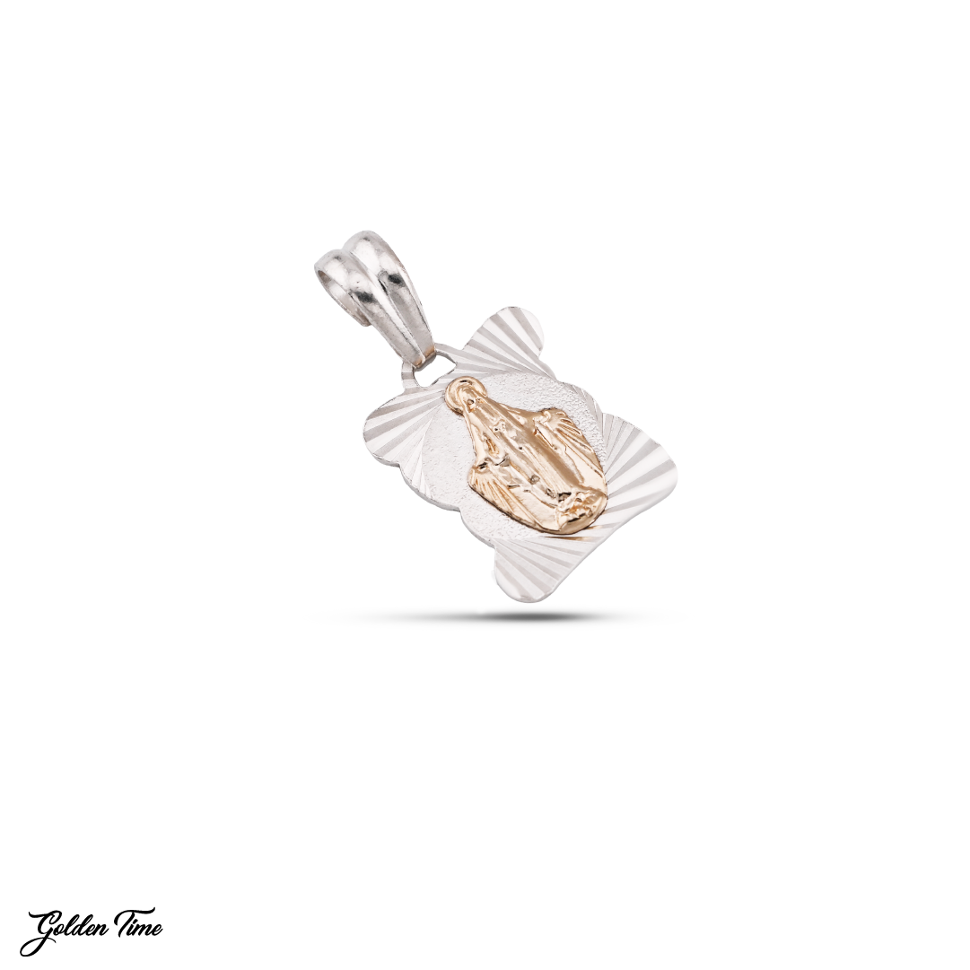 Este diseño rectangular con contornos ondulados presenta la figura de la Virgen Milagrosa en un acabado dorado en relieve, sobre una base plateada texturizada con destellos tipo rayo que crean un efecto luminoso y juvenil. Su forma única y su contraste de tonos lo hacen perfecto para uso diario con un toque espiritual fresco y contemporáneo.