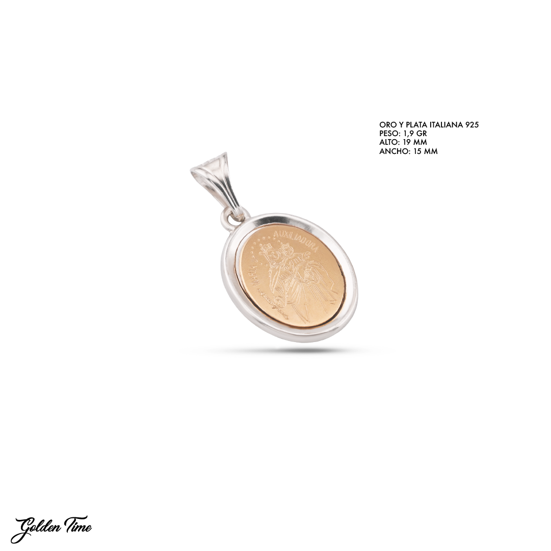 dije auxiliadora luz, lámina de oro 18k, oro y plata italiana 925, medalla auxiliadora, dije espiritual, joyería devocional, dije ovalado, estilo urbano espiritual