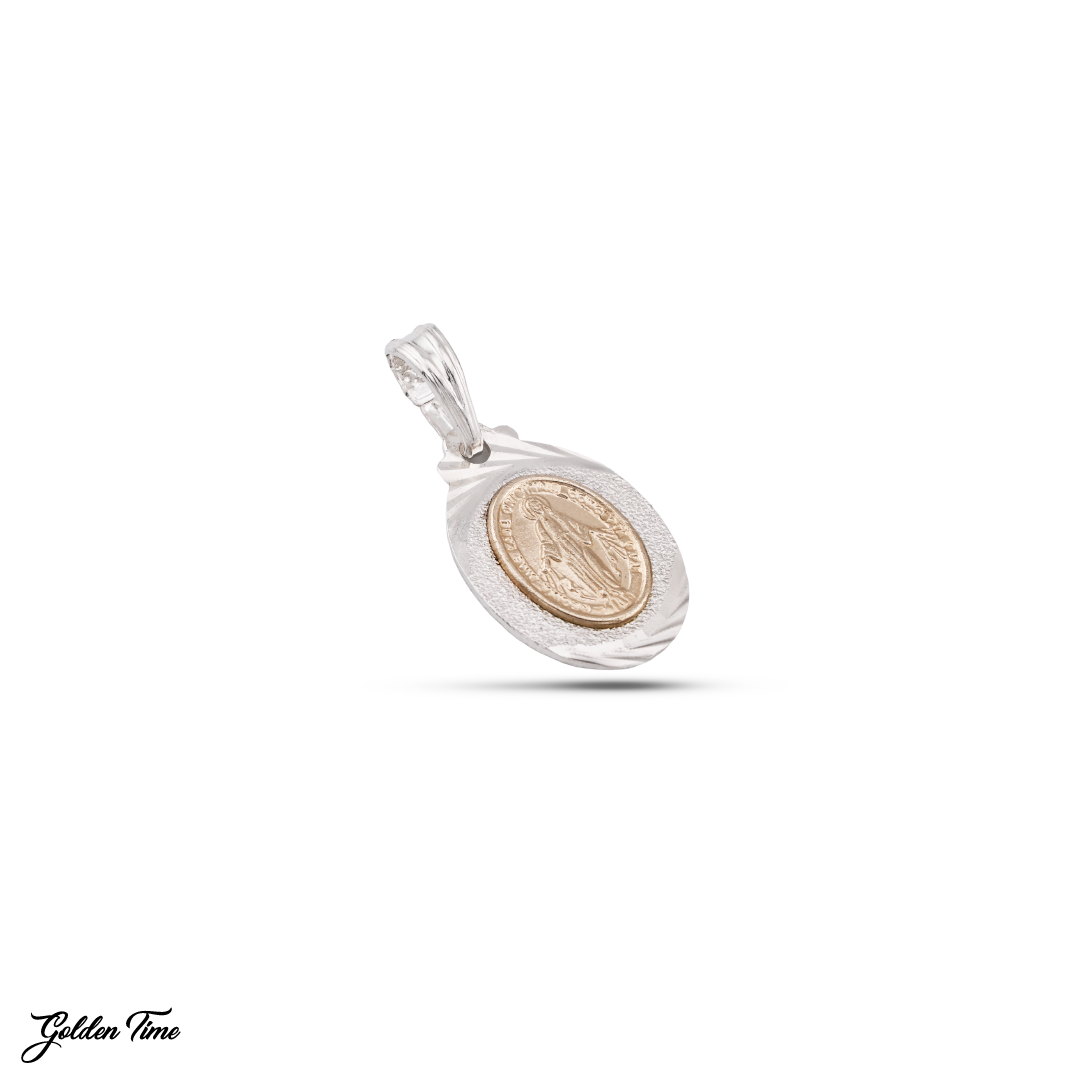 Este diseño ovalado presenta una placa plateada con un acabado texturizado que distribuye la luz de forma sutil, mientras que la figura dorada de la Medalla Milagrosa se destaca en el centro con un relieve preciso y delicado. Su estilo sobrio y su brillo equilibrado hacen de esta pieza un accesorio perfecto para quienes desean llevar un símbolo espiritual con un toque moderno.