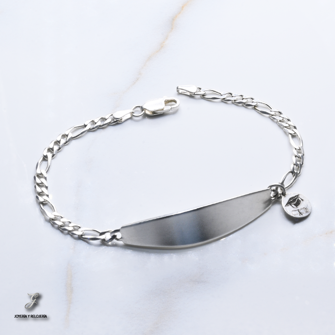Celebra tus logros con esta elegante y versátil esclava unisex. ✨ Fabricada en Plata Ley 925 italiana con un clásico tejido Figaro (3x1), esta joya es la combinación perfecta de robustez y estilo. Su placa curva y pulida es ideal para personalizaciones especiales que la convertirán en una pieza única.