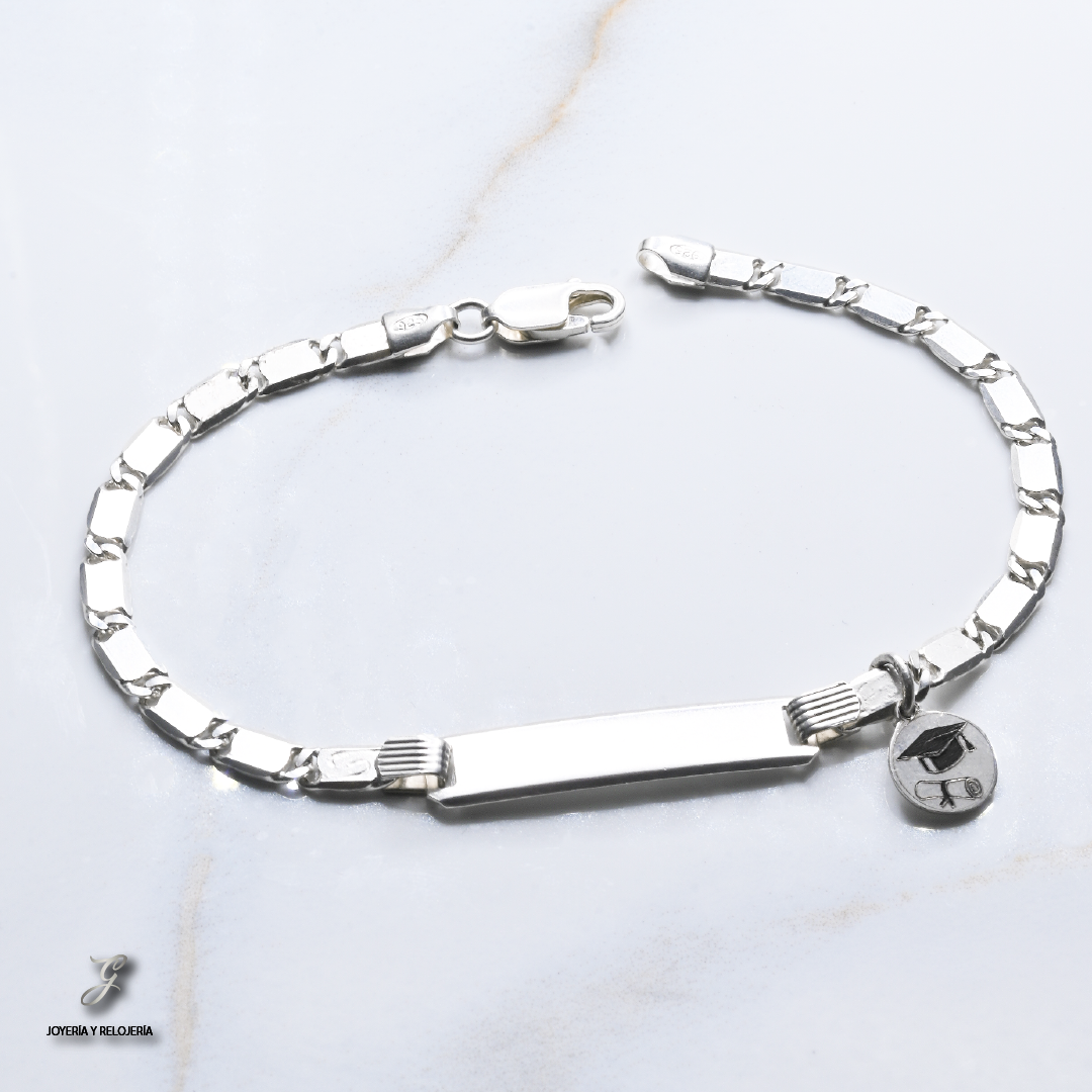 ¡Estilo clásico y versátil para un gran logro! 🌟 Esta esclava unisex está elaborada en auténtica Plata Ley 925 italiana y presenta un elegante tejido Valentino, un patrón que se adapta a cualquier estilo. Su diseño robusto y su placa lisa la hacen ideal para conmemorar tu graduación o cualquier hito importante.