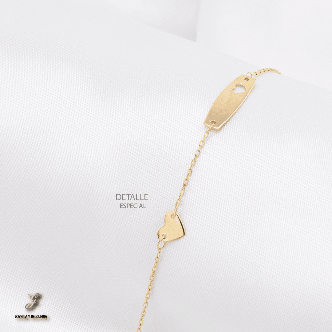 ¡La ternura y el amor en una joya que durará toda la vida! ❤️ La Esclava Delicada Corazón de Amor es una pieza encantadora, perfecta para un regalo de nacimiento o bautizo. Su fina cadena de eslabones separados lleva un hermoso dije de corazón, mientras que la placa tiene un corazón calado que le da un toque moderno y único. Es una joya ideal para ser grabada, convirtiéndose en un recuerdo inolvidable.