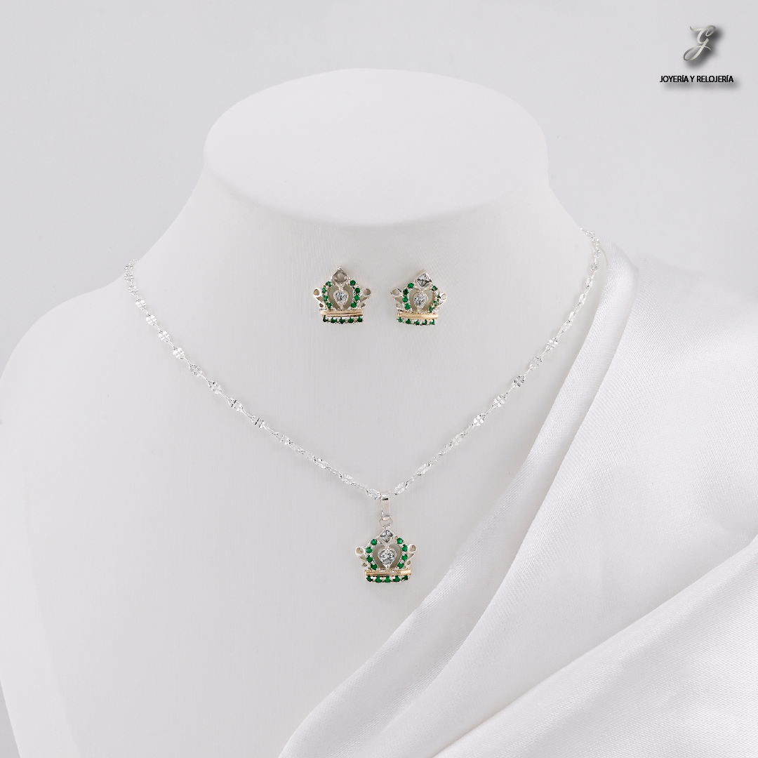 ¡Una joya digna de una princesa! 👑 Este majestuoso TRÍO CORONA PRINCESA 02 es el conjunto ideal para resaltar la elegancia en un momento especial. Se compone de un delicado dije y un par de topos (aretes) a juego, ambos con un detallado diseño de corona.