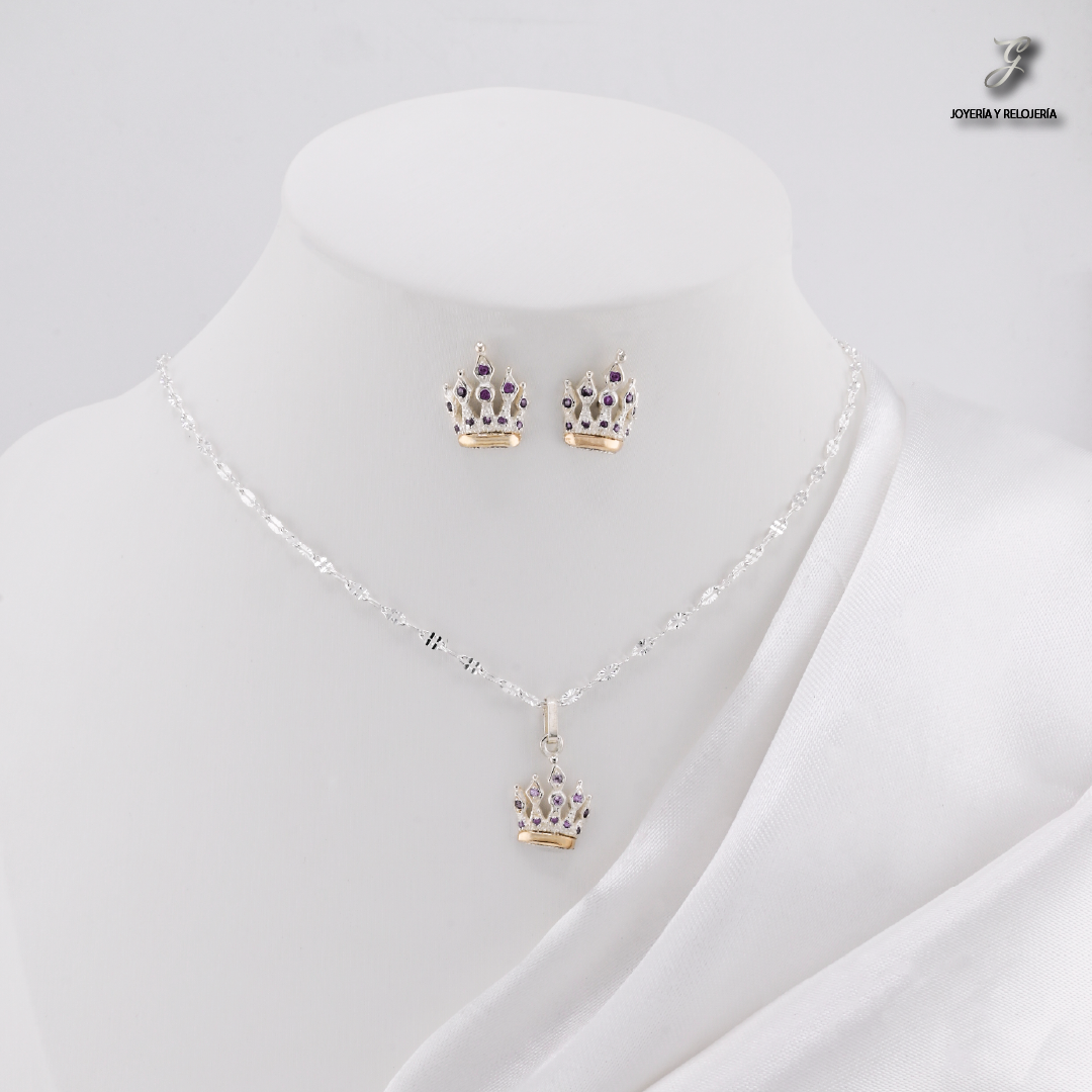¡Una joya de poder y distinción! 👑 Este imponente TRÍO CORONA IMPERIAL 05 es el símbolo perfecto de la nueva realeza que emerge en la celebración de los XV años. El conjunto incluye un dije y un par de topos (aretes) a juego, diseñados con la forma de una corona con puntas más marcadas.