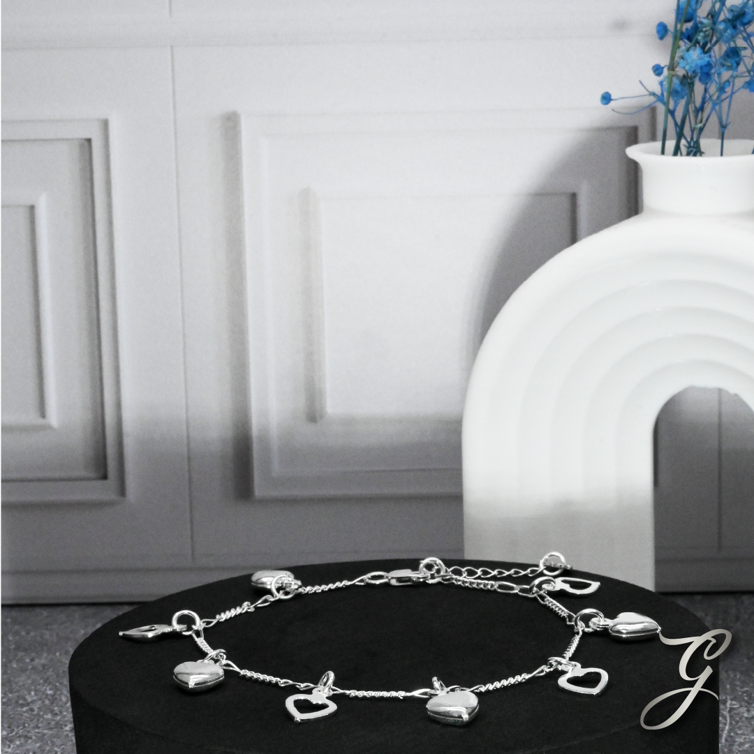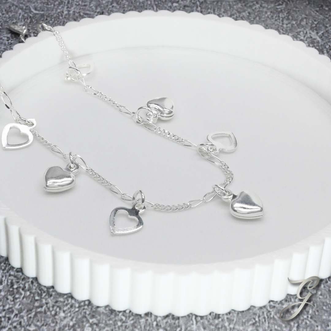 Romántica y delicada, esta pulsera elaborada en plata italiana 925 luce encantadores dijes colgantes en forma de corazón, símbolo de amor y ternura. Su diseño femenino y brillante la convierte en el accesorio ideal para regalar o llevar contigo cada día.