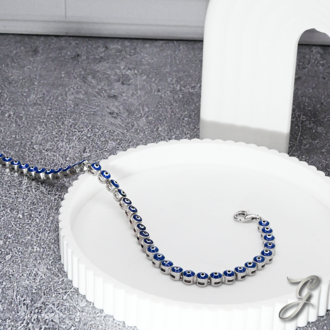 Diseñada para atraer protección y buena energía, esta pulsera incorpora el tradicional ojo turco, símbolo de defensa contra las malas vibras. Elaborada en plata italiana 925, combina significado espiritual con un diseño moderno y elegante, ideal para uso diario o como amuleto personal.