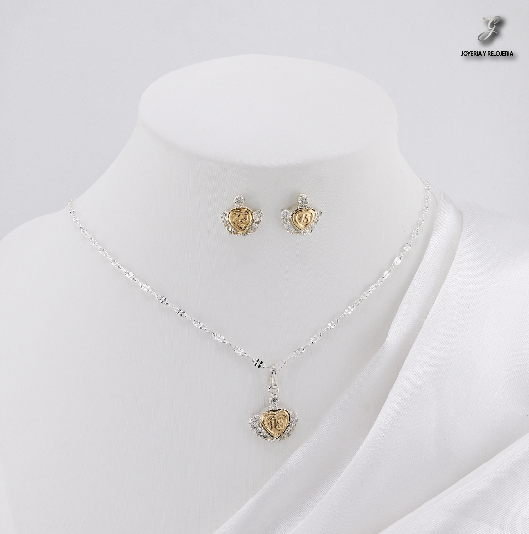 ¡El trío de éxito que enamora! 🌟 Este popular TRÍO CORONA ÉXITO XV 07 es uno de nuestros diseños más vendidos, combinando la delicadeza de una corona con la conmemoración del gran día. El conjunto incluye un dije y un par de topos (aretes) a juego.