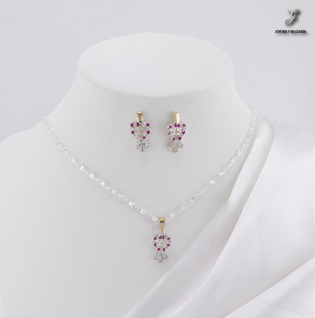 Elaborado en Plata Ley 925, la parte superior de cada joya tiene un delicado toque de lámina de Oro de 18 Kilates. El diseño principal se define por una forma de corazón invertido engastado con brillantes Circones Suizos de alta calidad, del cual cuelga una piedra adicional en forma de lágrima o marquesa. Es un trío que simboliza el crecimiento y la gracia.