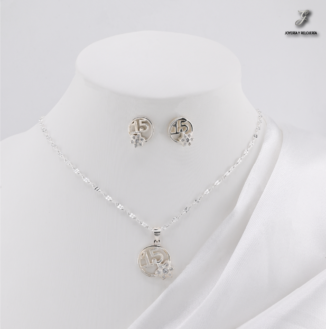 Elaborado completamente en Plata Ley 925, cada pieza presenta un diseño circular moderno con el significativo número "15" calado. En un lateral, el diseño se complementa con una delicada flor engastada con brillantes Circones Suizos de alta calidad. Su acabado en plata pura resalta la limpieza y el brillo del diseño.