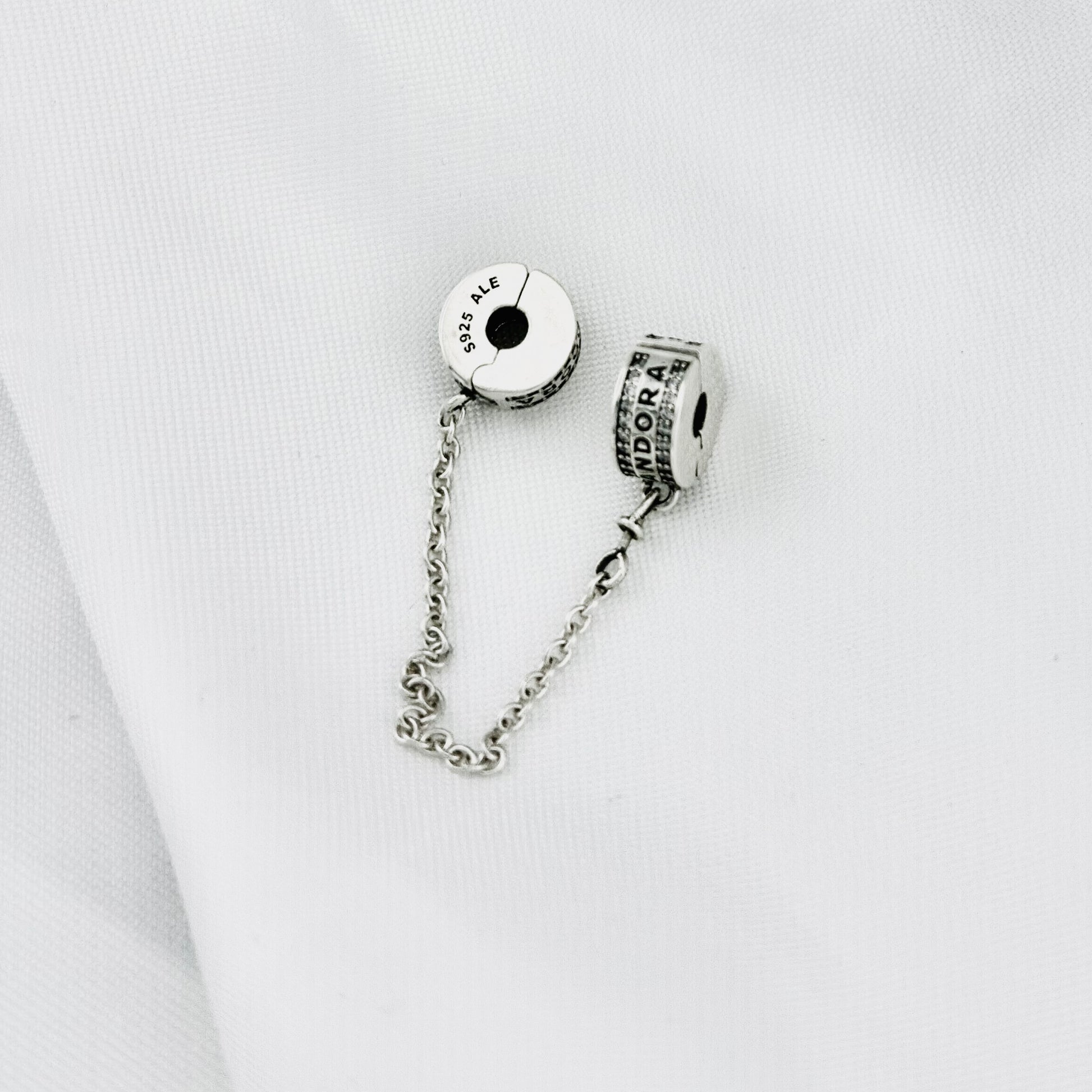 Protege tu colección de charms con estilo con nuestra sujetador de Seguridad Pandora Logo. Este accesorio de plata, diseñado para funcionar como un broche de seguridad, presenta dos clips, cada uno con el icónico logo de Pandora y dos hileras de brillantes piedras transparentes. La cadena conecta ambos clips, asegurando que tus charms favoritos no se caigan cuando te quites el brazalete.
