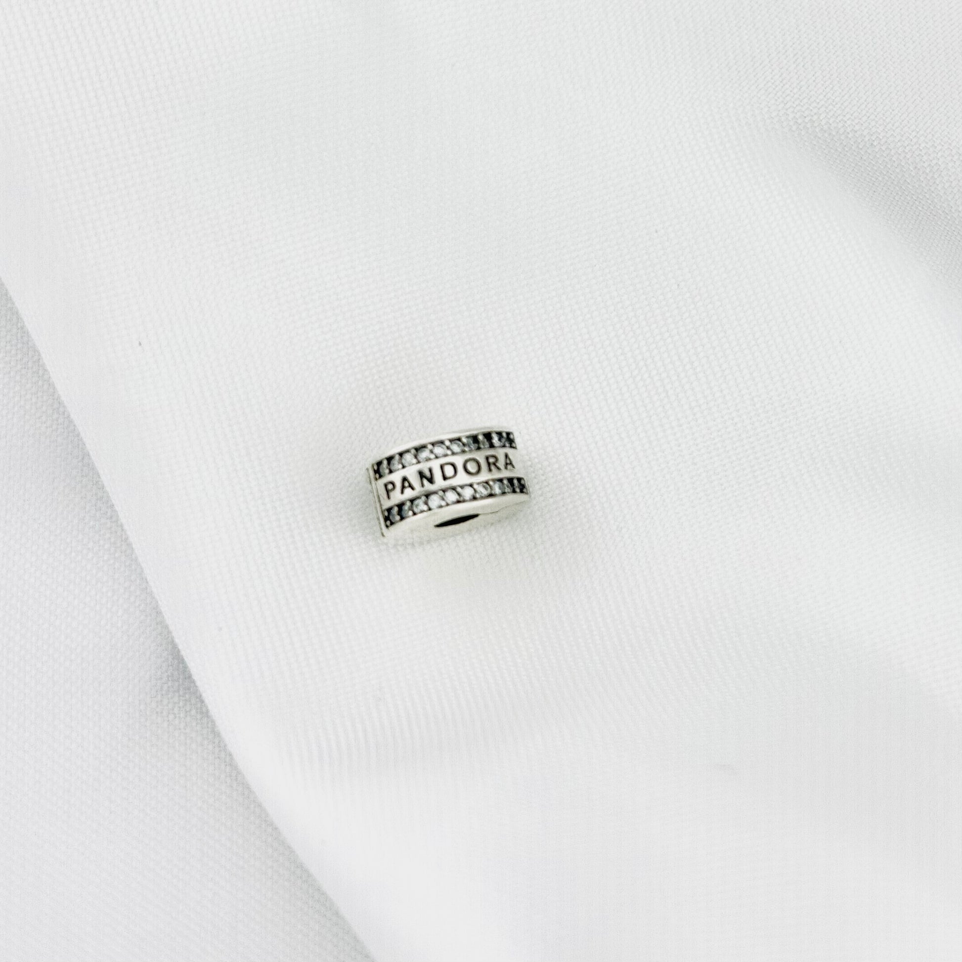 Brinda a tu colección de charms una actualización contemporánea con este sujetador acabado a mano en plata esterlina con deslumbrantes circonias cúbicas y el icónico logo de la marca. Este sujetador forma parte de la elegante colección Elegancia Atemporal y el patrón de circonias cúbicas único que tiene a cada lado, le otorga un estilo sutil pero atractivo que te agregará un elemento de sofisticación siempre que lo uses. Es ideal para mantener tus charms favoritos en su lugar, con una seguridad extra y duradera. Asegura tu estilo con este elegante sujetador.